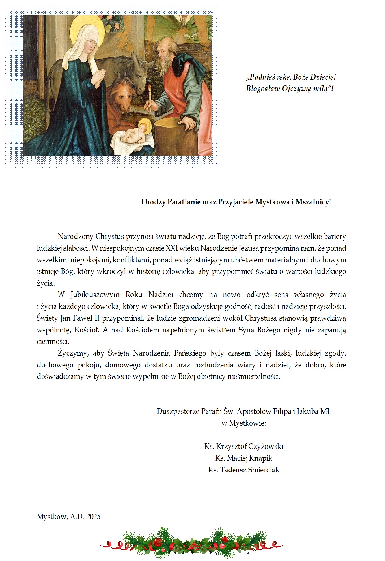 Wielkie kolędowanie w we wnętrzu pięknej i zabytkowej świątyni Mystkowskiej. Czas: Sobota, 27 grudnia, o godz. 18.00. Wykonawcy: Orkiestra Dęta z Mystkowa, Zespoły Regionalne: Mali Mystkowianie, Mali Mszalniaczanie i Mały Skalnik oraz zaproszeni soliści.